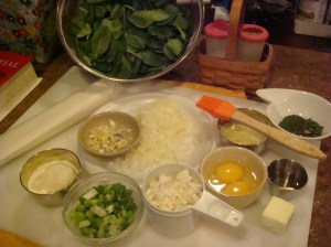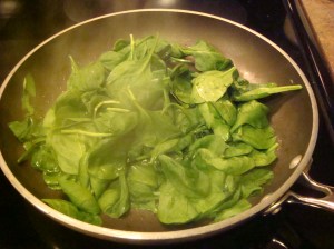 Heat the oven to 350 degrees. Discard any tough stems from spinach, wash, and drain well. Coarsely chop.