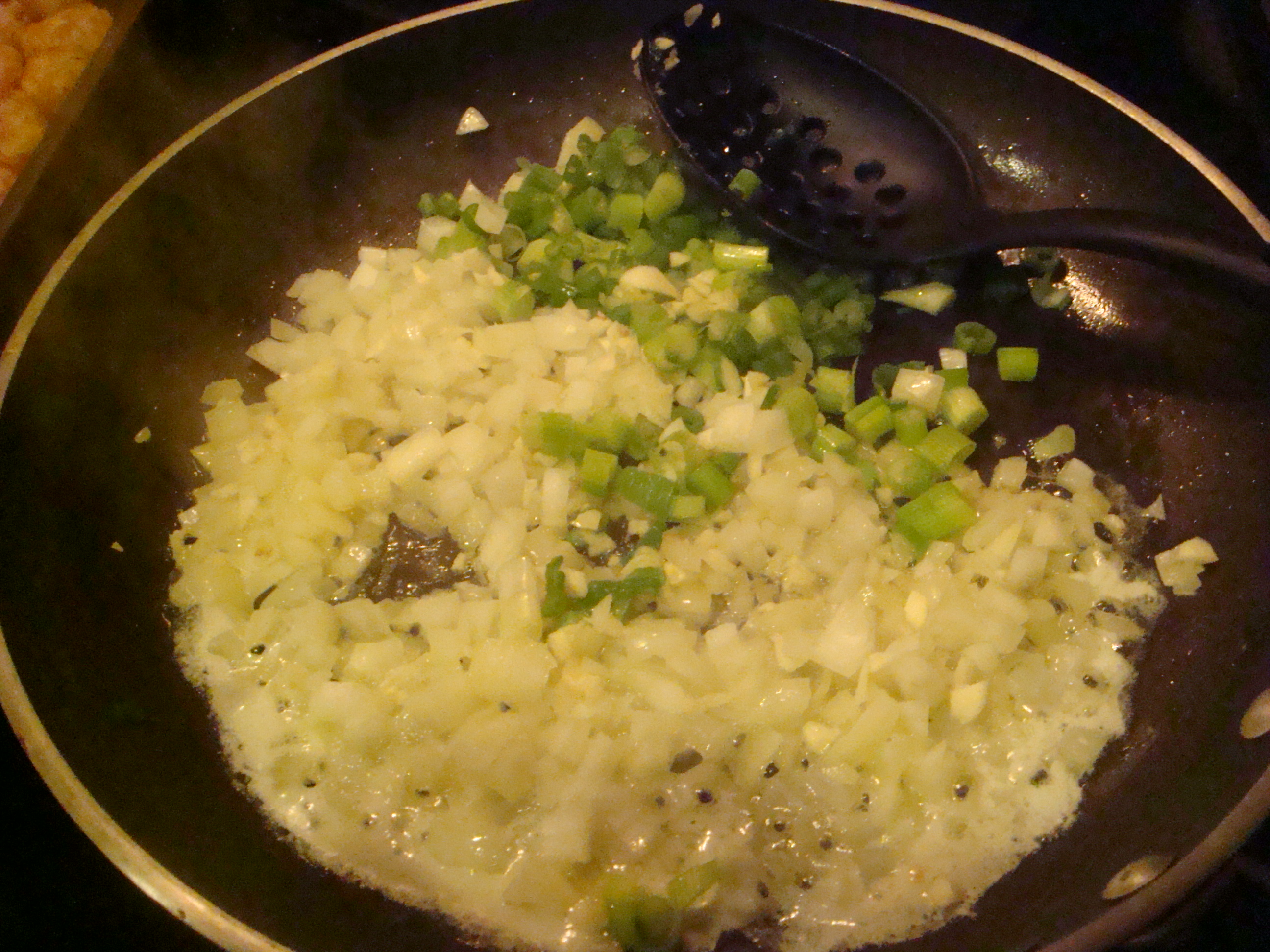 Melt the butter in the same skillet over medium heat and cook the onions, garlic, and scallions until wilted, stirring often. When the mixture starts to brown, transfer it to a mixing bowl. Let cool.