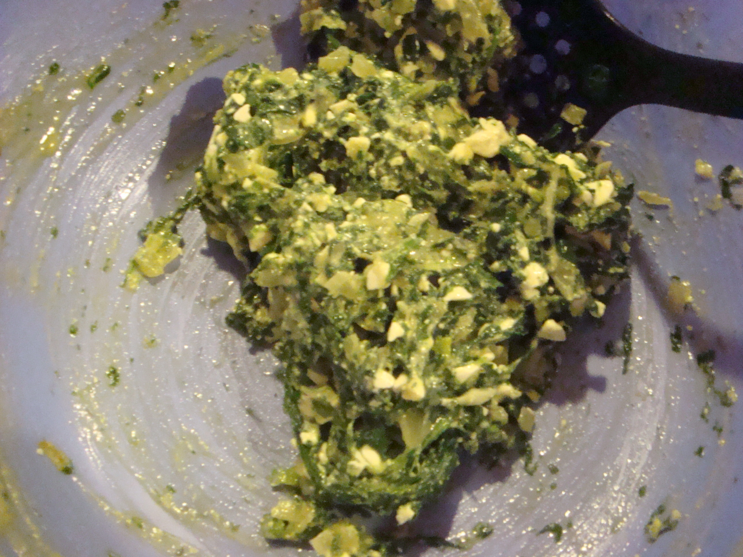 Add the spinach and cook until wilted. Drain well in a colander (set the pan aside) and press with the back of a large spoon to push out excess moisture.