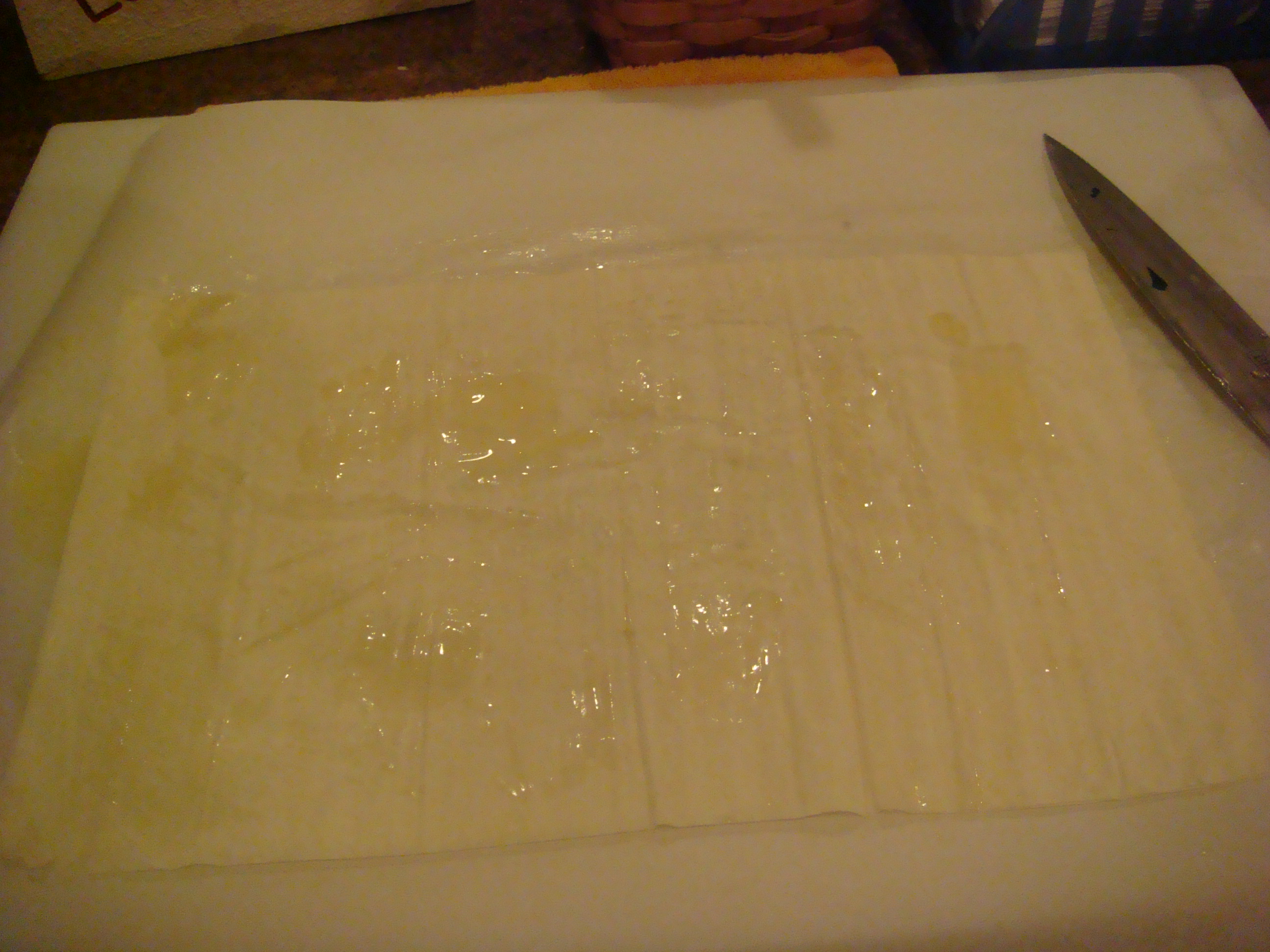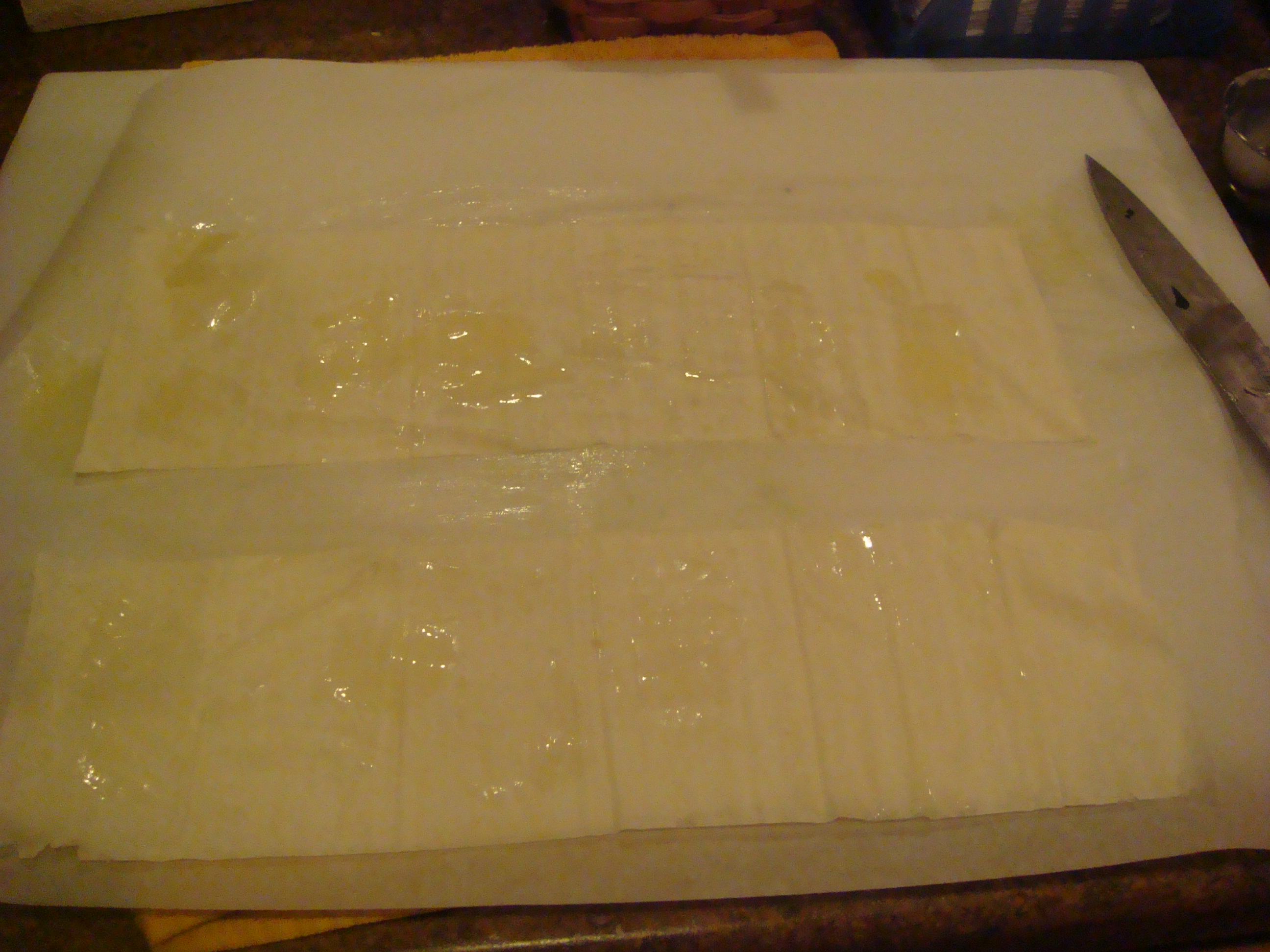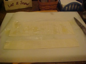 Spread out 1 sheet of phyllo and brush with butter. (keep the rest of the phyllo covered with a slightly dampened cloth, or it will dry out.)