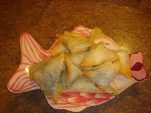Fold one corner of the rectangle over the spinach filling to make a triangle. Fold this triangle over itself toward the top—as you would fold a flag—and continue folding up until triangle is produced. Brush this all over with butter and put on the baking sheet. Continue making triangles until all the spinach filling is used.