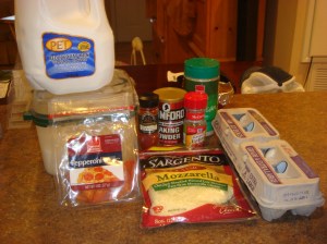 • Whisk in the milk and egg. Stack slices of pepperoni and cut into small pieces.