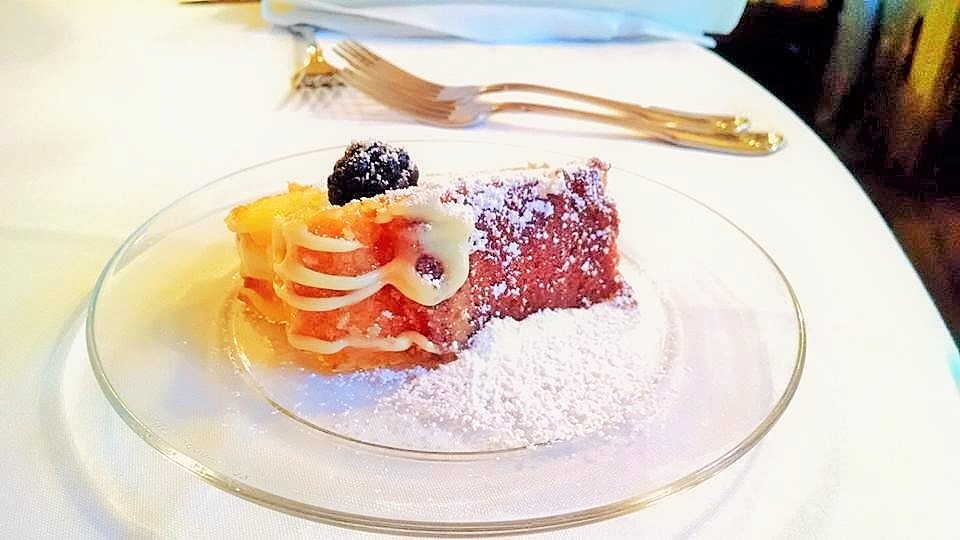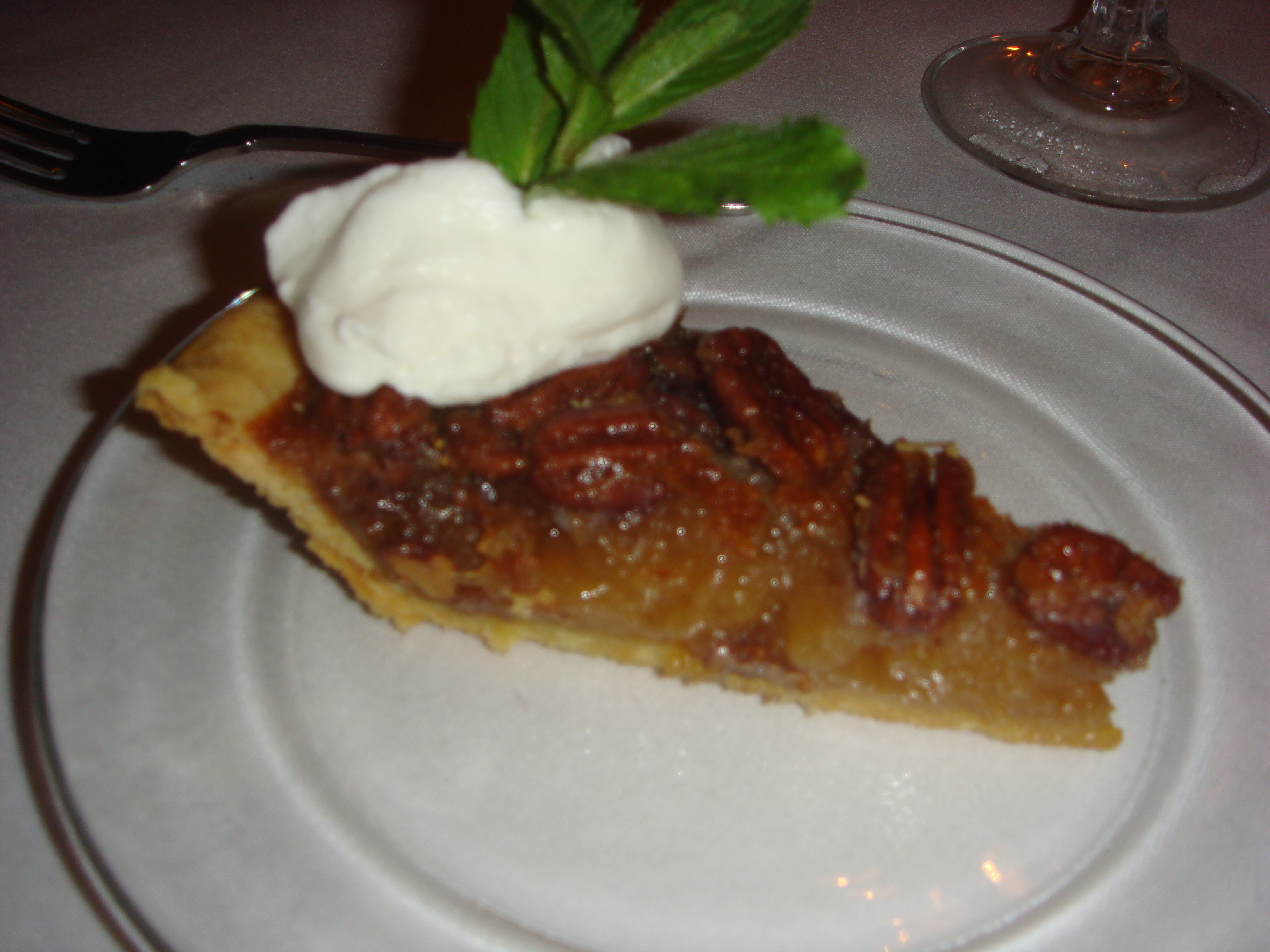 For your dessert course you are given a choice between carrot cake and pecan pie. Either one is lovely. My husband got the carrot cake and it is a small individual cake piped with cream cheese frosting. I tasted a bite and it was so fresh and had chewy golden raisins for extra sweetness. I got the pecan pie and it was topped with freshly whipped cream which has been the topic of much discussion among my dining companions. I tasted a hint of rose petals, almost like rose water was whipped into the cream, but when we asked the chef, he assured us it was cardamom. I remain unconvinced, but I will tell you that the pecan pie was lovely. I prefer mine without roses, however.