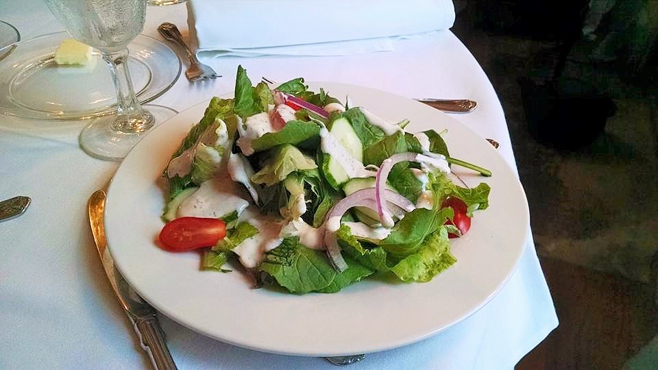 Soon after, your salad course arrives. It is a plate of locally grown baby greens with Mansour’s Ranch dressing. This dressing is better than any Ranch I’ve had at any other restaurant, including my own. It is thinner than what I am used to, perhaps with vinegar? Don’t mistake that for less flavor, it packs a wonderful punch. The salad also has locally grown tomatoes (ripe, red and juicy!) cucumbers and red onion.