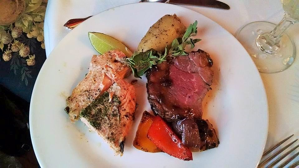 For the main course we were served Poached Salmon with Greek Herbs, Roasted Fingerling potatoes and vegetables and Roasted Tenderloin of Beef. The salmon was served cold and gave a perfect contrast to the beef. We were served buffet style.