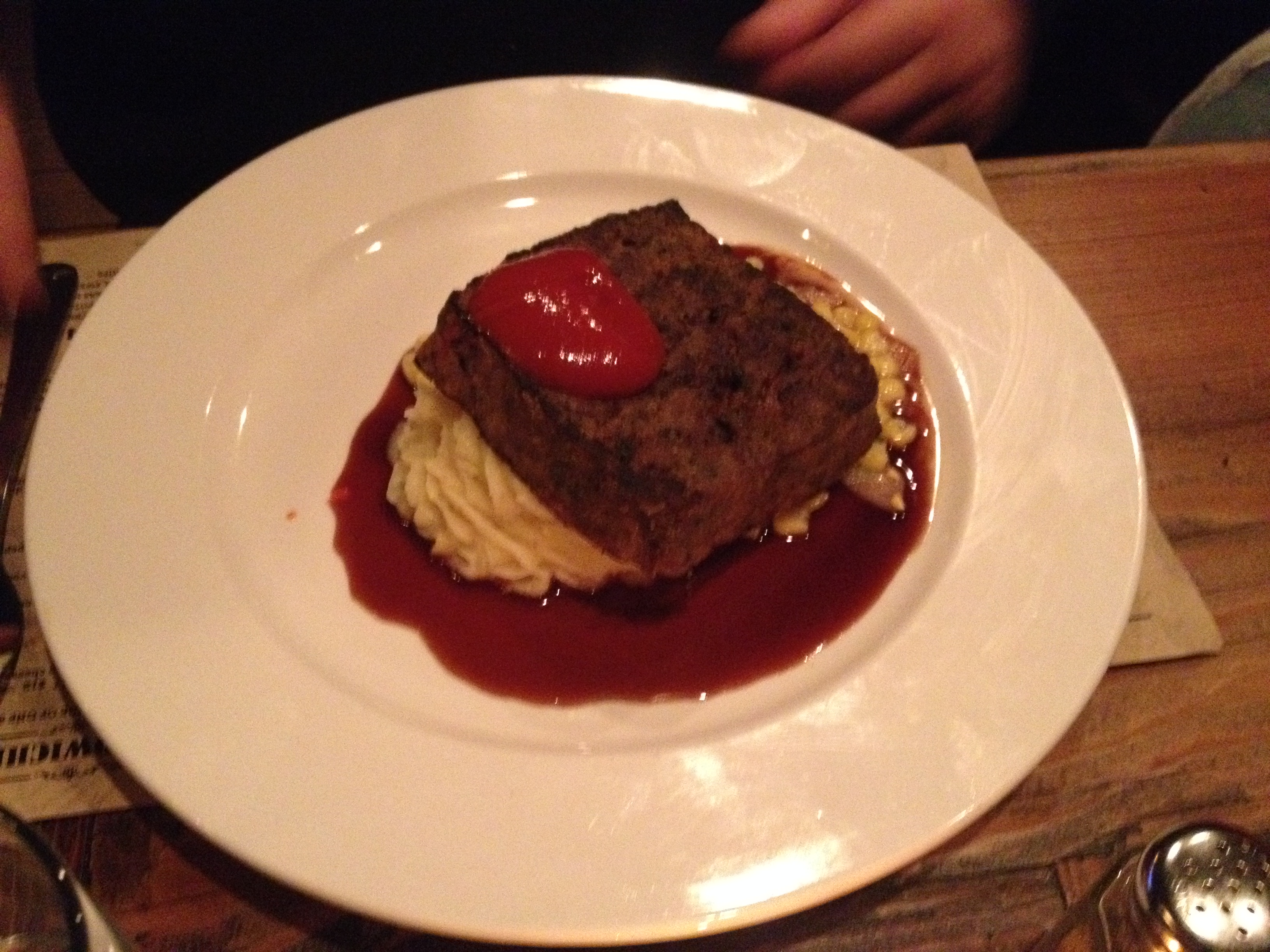 The guys got the meatloaf. It is described as seasoned ground beef topped by sriracha ketchup and red wine sauce. I only got a tiny taste, but it was really good meatloaf. Tender, not greasy at all, and that ketchup. Wow. Nan needs to bottle it and sell it. Dustin opted for double starches with mashed potatoes and macaroni and cheese. It worked.