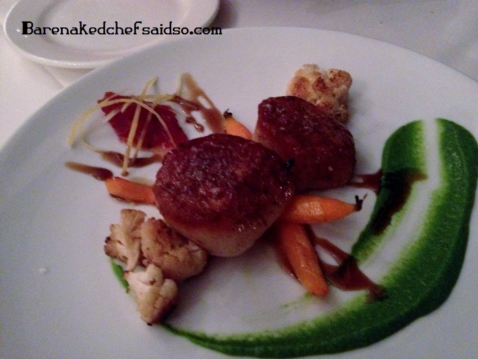 While waiting for our main courses to arrive, the server brought us another treat from the chef. This one was seared scallops and they were so blissful. The scallops were perfectly seared with a crispy crust and tender inside. They sat atop a bright green fresh pea puree’, roasted sweet baby carrots, jalapeno jam and roasted cauliflower. There was also a sherry gastrique underneath that had an Asian flavor, tangy and sweet, that owned me. My husband pronounced those the best scallops he’s ever had.