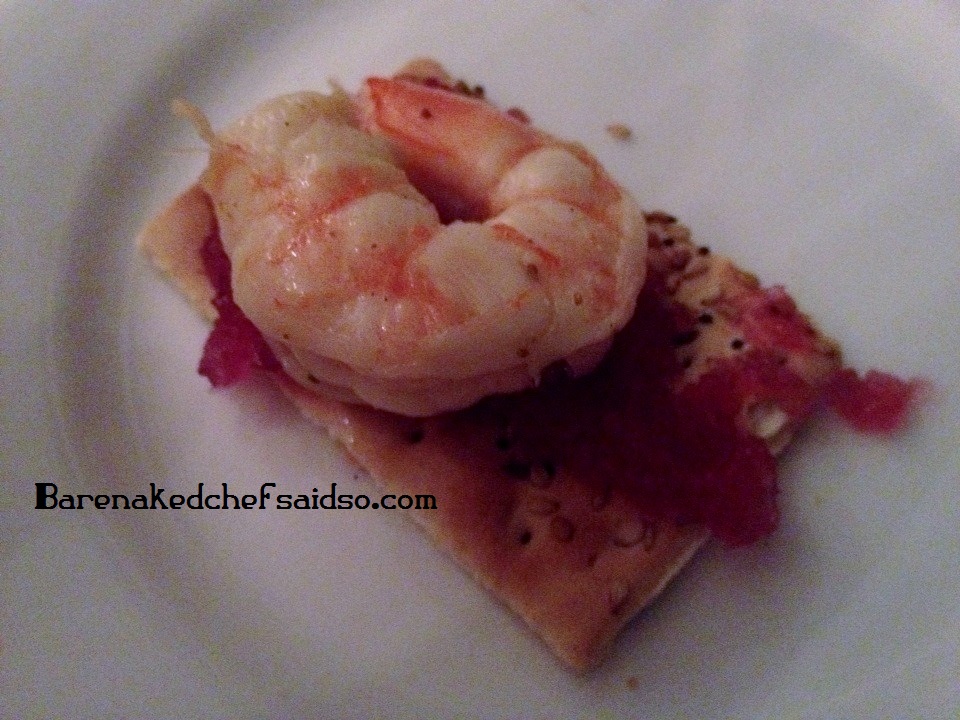 Before our appetizers, the server brought an amuse-bouche (thanks, Top Chef for that vocab lesson!) for us to sample. Dustin MAY have let it slip that I write a blog, so there’s the reason for that extra treat. The treat was a pickled shrimp on a lavash cracker slathered with onion jam. The shrimp was firm, fresh and chilled and just slightly pickled with fenugreek, coriander, mustard seed, bay leaf and white wine. The jam was sweet with a hint of cinnamon. Beautiful together!