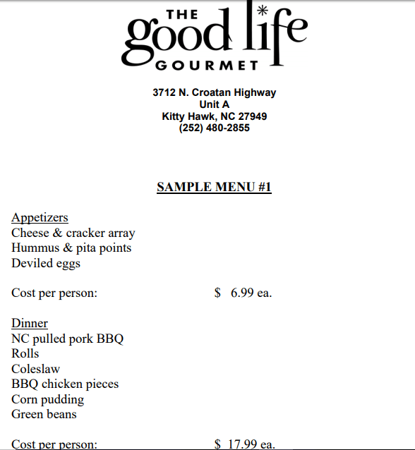 OK, so I found this restaurant people talk about called The Good Life there. Knocking around that website, I see that they cater. They are custom caterers, meaning they’ll do exactly what you want. Even your favorite FAMILY recipes. That idea is so cool to me! I checked the menus they had online and found one that seemed really delicious for a beach side barbecue.