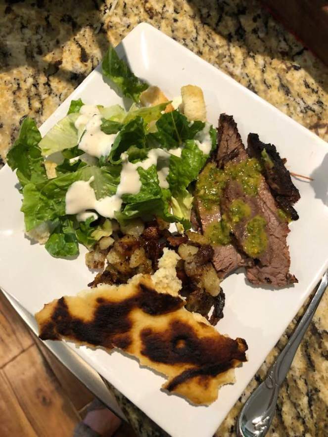 Key West Flank Steak with Chimichurri Sauce, Potatoes and salad with grilled naan
