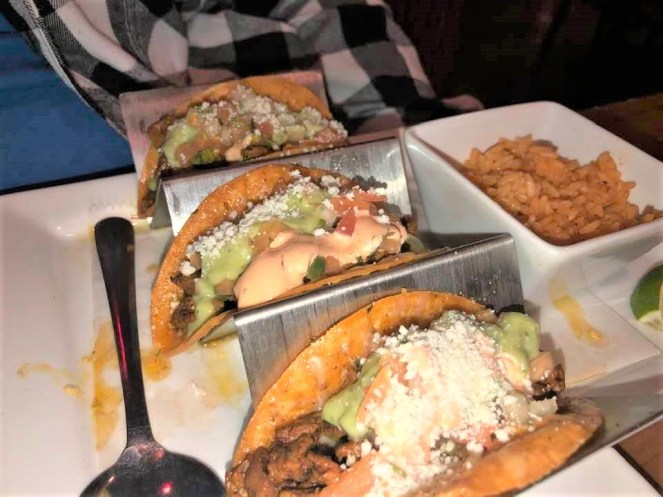 Ty had the Tacos Verde which were small but tasty. He ordered a side of rice to accompany. The tacos had tasty marinated steak and were topped with chipotle rouille, avocado salsa, Monterrey jack and cotija cheeses. Yum!