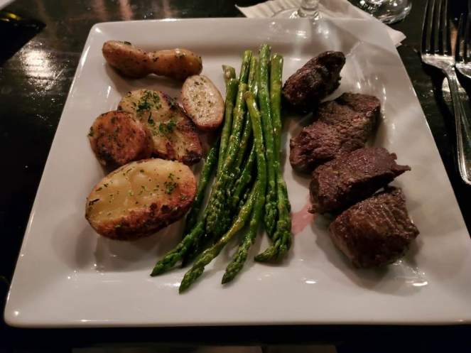 We had two entrees: Grilled Salmon and Tenderloin Medallions. Both were great, but the tenderloin was a tad overcooked. It was served with fried potatoes and asparagus. All very good. Nothing incredible.