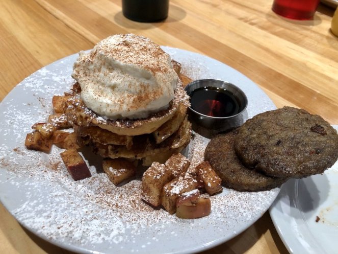 My breakfast loving son got the biscuit french toast which was another amazing dish. Scattered with sweet apples and topped with a whipped cream, it was like a decadent dessert.