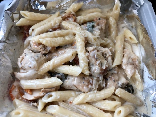 As it is, they allow you to call in and they’ll deliver your order to you curbside. You don’t even have to leave the car! My order was super inexpensive too, especially considering the amount of food they give you! I got the delicious pasta with a creamy sauce and tender chicken, studded with sun dried tomatoes. Perfectly seasoned and so good! This came with a garden salad and two pieces of garlic bread.