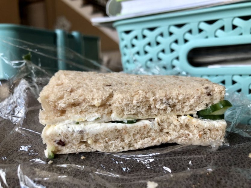 - Butter each slice of bread (prevents sogginess.) Lay slices with butter side up on a work surface. Evenly distribute the cream cheese mixture onto each slice. Arrange towel-dried cucumber slices on top of the first 3 slices of bread. Top with remaining bread. Slice off the crusts. If not serving immediately, wrap tightly in cling wrap and chill for up to 24 hours.