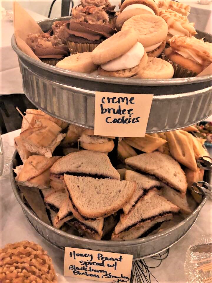 Peanut butter and jam sandwiches, Chicken salad sandwiches, Creme Brulee cookies and German Chocolate Cupcakes