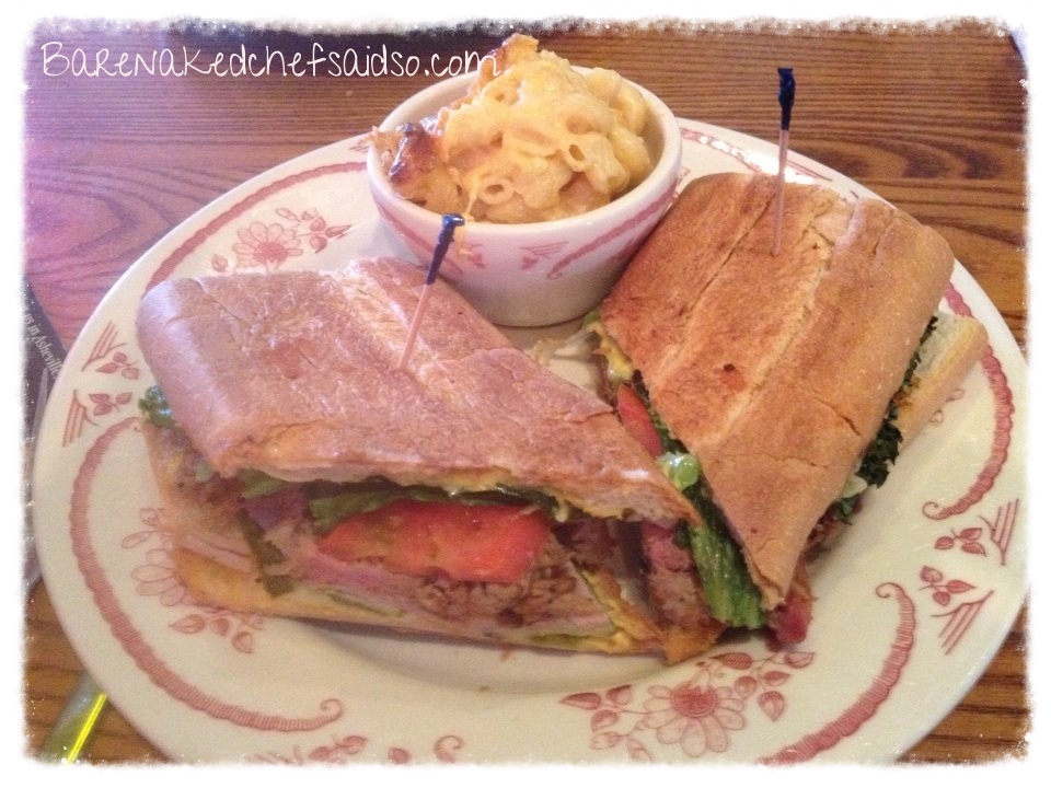 The Cuban sandwich was the menu item that immediately drew my attention.  In fact, once I saw it, I stopped looking.  The pressed sandwich is chock full of sliced ham, barbecued pork, Swiss cheese and topped with mustard, lettuce and tomato.  I had never had a Cuban with the lettuce and tomato, and next time I’ll leave those off.  The bread got so flat and crispy in the pressing, and the barbecue pork taking the place of a sliced pork cutlet lent a smokiness to the sandwich.  I chose macaroni and cheese as my side and it was creamy  and cheesy topped with a crusty coating of baked cheese.  It was the best macaroni and cheese I’d ever had at a restaurant.  How about that?