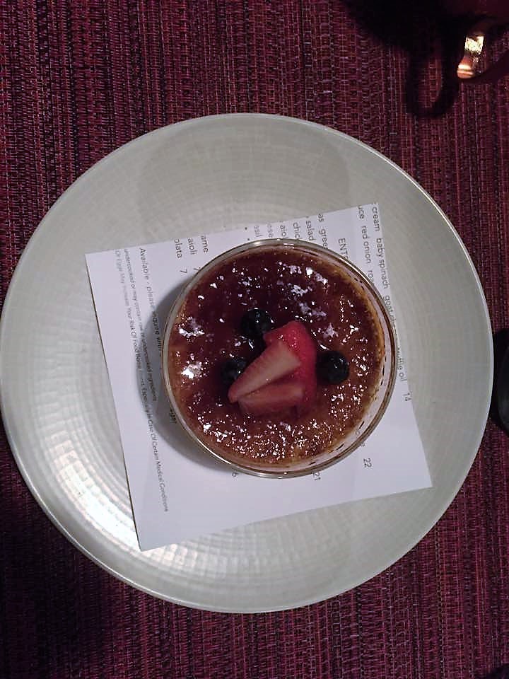 My choice for dinner was a special. It was Grilled beef tenderloin, Caesar style potatoes & Swiss chard. I had to send mine back because the steak was too rare for me (cold red center, blech) but they brought it back a few minutes later and it was perfect. OK, still pretty red on that far right one, so I didn’t eat it. But the rest was very delicious. The meat was so tender, and seasoned perfectly. I LOVED the small little potato coins and the parmesan sauce they were in. Also, I never knew I loved Swiss chard so much.