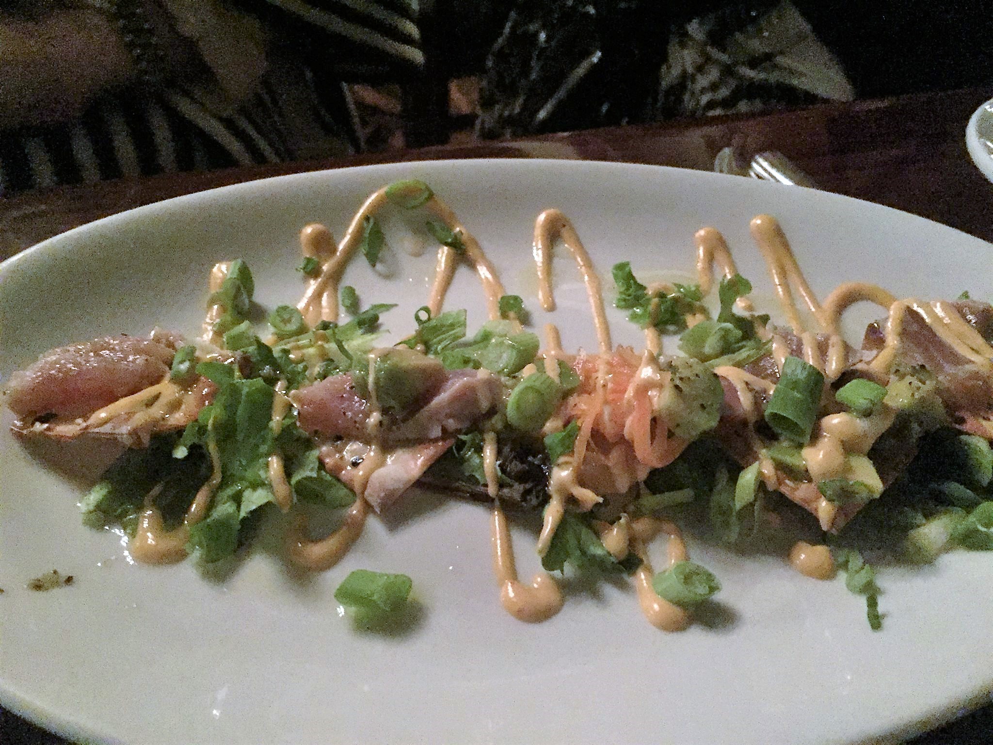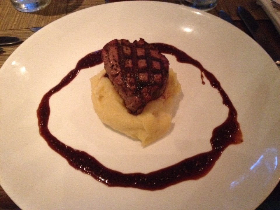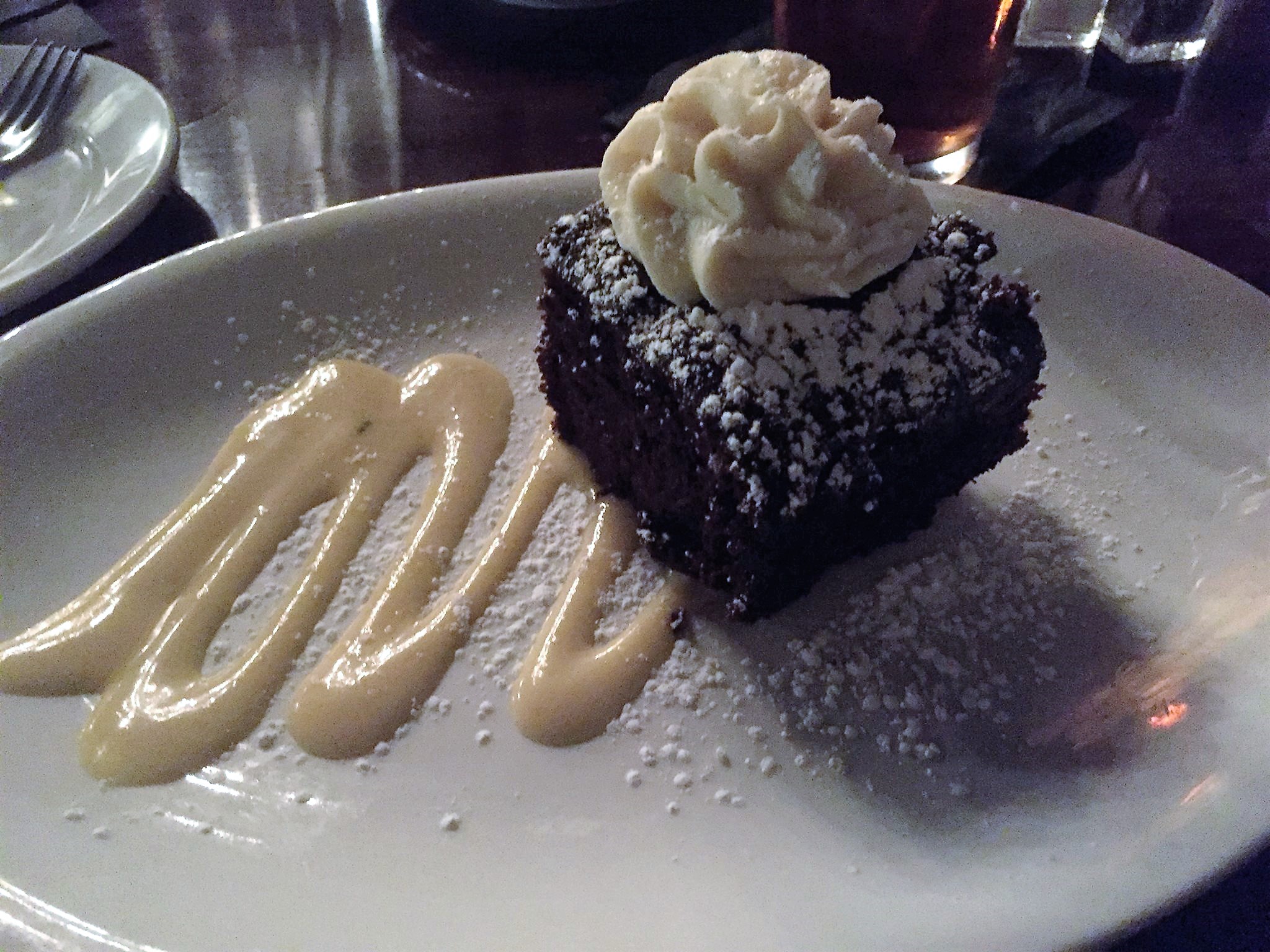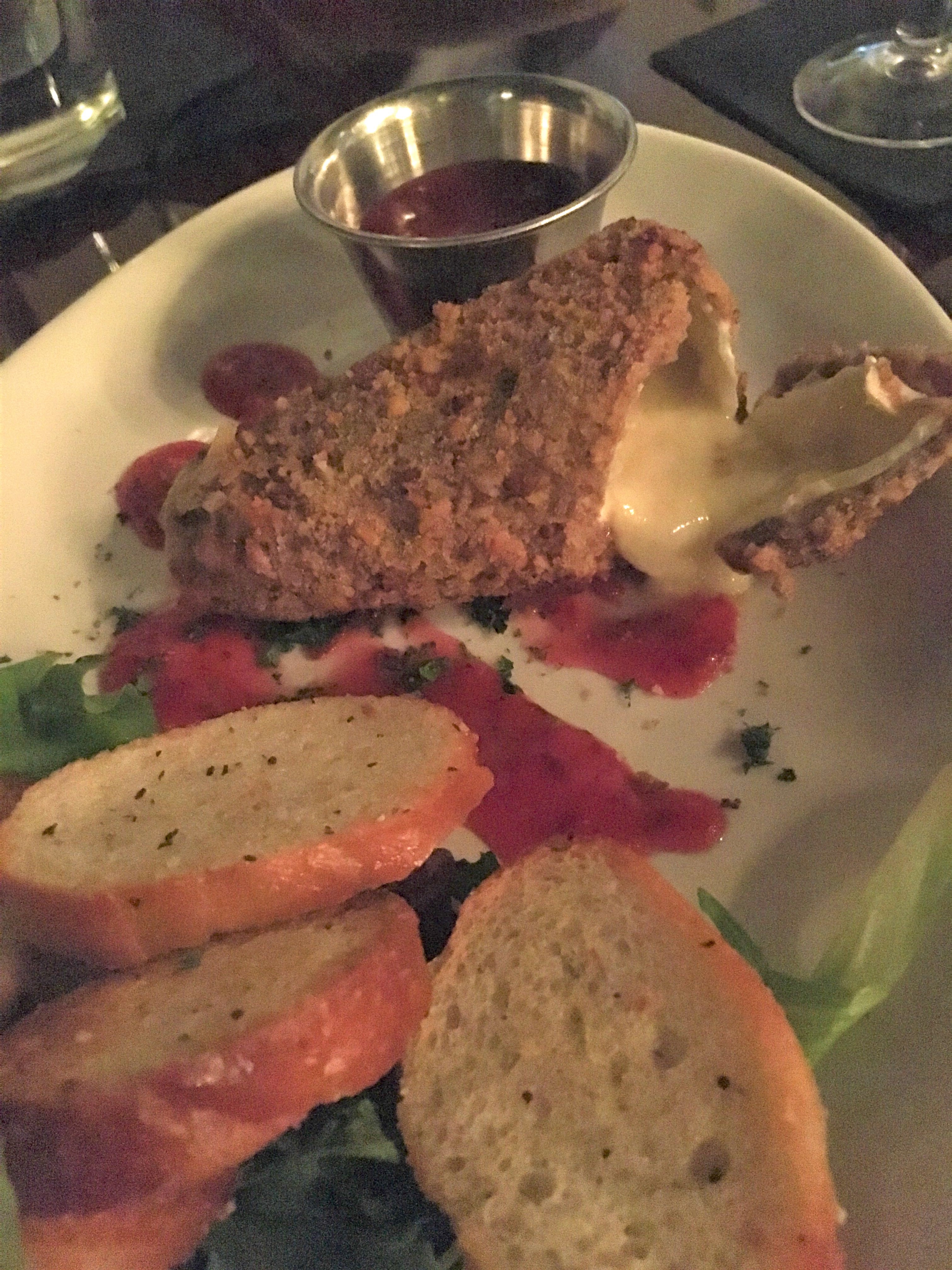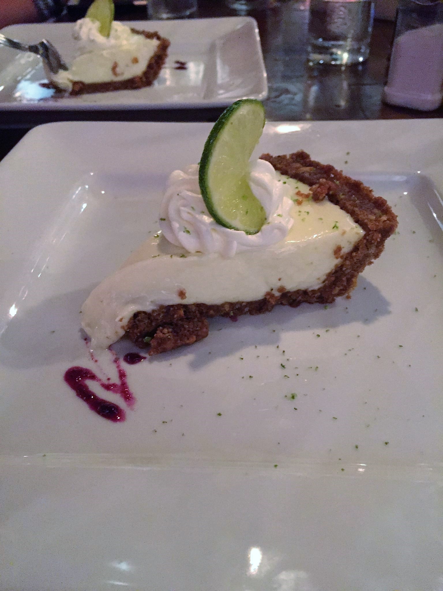 Our friend got the crab cake, which was served atop a fried green tomato with vegetable slaw and a sriracha sauce. He said it was in need of salt and a little bland, but cooked perfectly. He wasn’t wild about the fried green tomato with it.