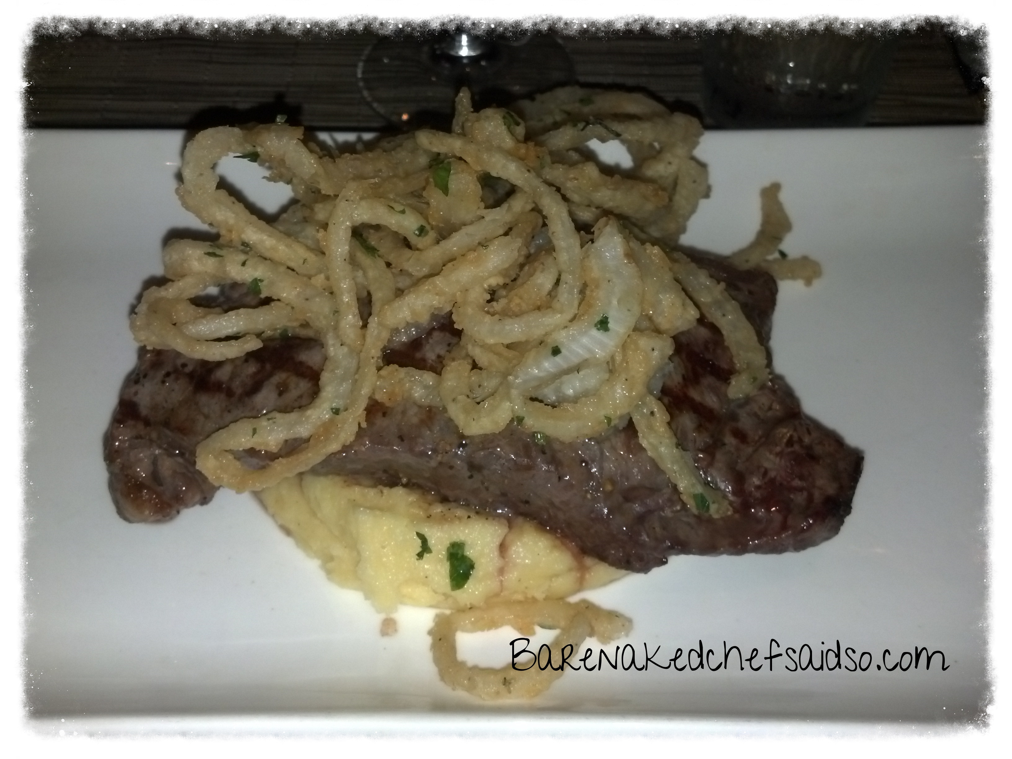 My husband got the NY Strip. It was slightly better, but the real show stopper for me was the fried onion strips on top. They were fried delicately and perfectly. These folks really seem to know how to fry. Nothing was soggy, everything crispy and perfectly seasoned.