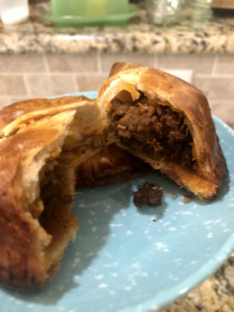 These are actually pretty simple.  They use refrigerated pie crusts and the meat only simmers for 15 minutes.  Still doggone delicious!  I found this recipe at Great Grub Delicious Treats.