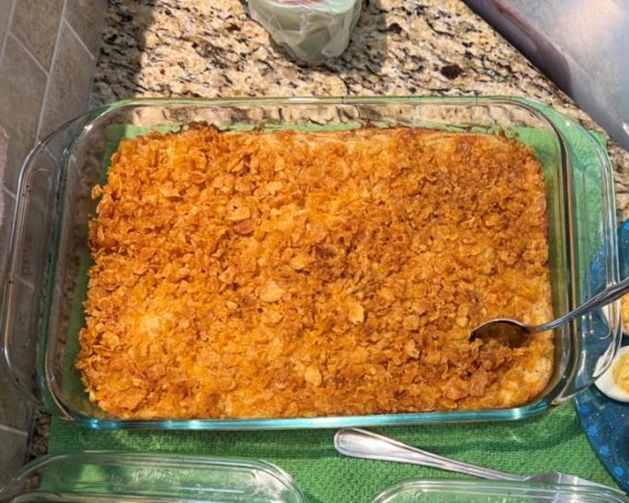 Mix first 8 ingredients together well, saving 1/4 cup butter. Pour into big buttered casserole dish. Top with cornflakes and drizzle with 1/4 cup melted butter reserved. Bake at 350 for one hour. Can be halved at half the cooking time.